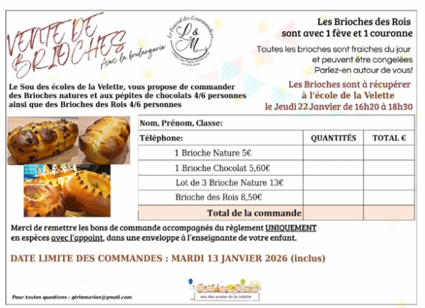 Le sou des écoles organise une vente de brioches afin d’aider l’école à financer ses projets et sorties scolaires. Le bon de commande est à remettre à l’enseignant de votre enfant. Merci de votre participation !